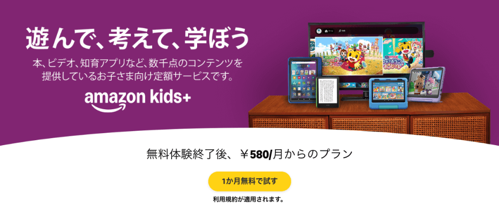 一方でキッズモデルのKindle端末を購入すると、通常月額580円の「Amazon kids+」を6ヶ月間無料で利用することができます。